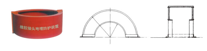 此地埋裝置為兩個半圓形中空組合而成.將橡膠頭和管道平焊法蘭全部裝入體內,兩端設有兩半圓形小平面帶鋼騎于兩惻法蘭外管壁.兩端立面支撐根據土層深度而定.足以承受外壓負重。該裝置配有一定數量對臺鎖緊螺栓, 以備安裝完畢后裝配。其安裝方法為:安裝橡膠接頭—>保護裝置內涂防銹柒—>安裝下部1/2保護裝置放上上部1.2保護裝置—>旋緊對合鎖緊螺栓(注意安裝時要使橡膠接頭確保處于裝置中間位置)—>保護裝置外涂防銹柒回填原土.下部搗實,上部夯實—>三合土和墊層—>鋪設地面(在適當位置設有性標志.以備以后檢查更換時確定位置)。