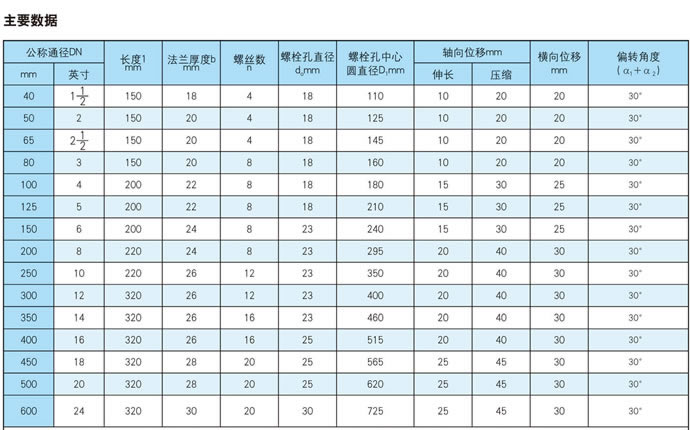 注 1.特殊要求可來函來圖定制.法蘭按《全國通用給排水標(biāo)準(zhǔn)圖集》,其它按HG/T2289-92檢驗。 2.懸空給水使用DN200以上產(chǎn)品 管道有固定支撐或固定托架,否則產(chǎn)品應(yīng)安裝防拉脫裝置。 3.用戶使用橡膠接頭,對應(yīng)法蘭應(yīng)是閥門法蘭或符合GB/T9115.1(RF)法蘭。 4.DN40-600 PN=1.6MPa 2、DN40-200 PN 2.5MPa