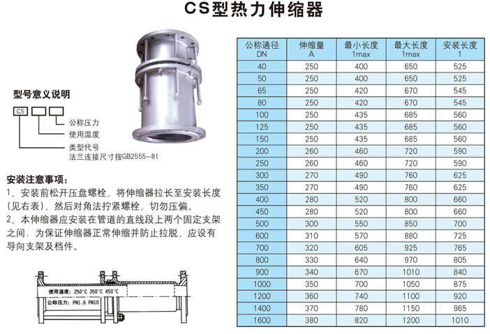 安裝注意事項: 1、安裝前松開壓盤螺栓.降伸縮器拉長至安裝長度(見右表),然后對角法擰緊螺栓,切勿壓偏。 2、本伸縮器應安裝在管道的直線段上兩個固定支架之間,為保證伸縮器正常伸縮并防止拉脫.應設有導向支架及檔件。