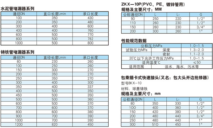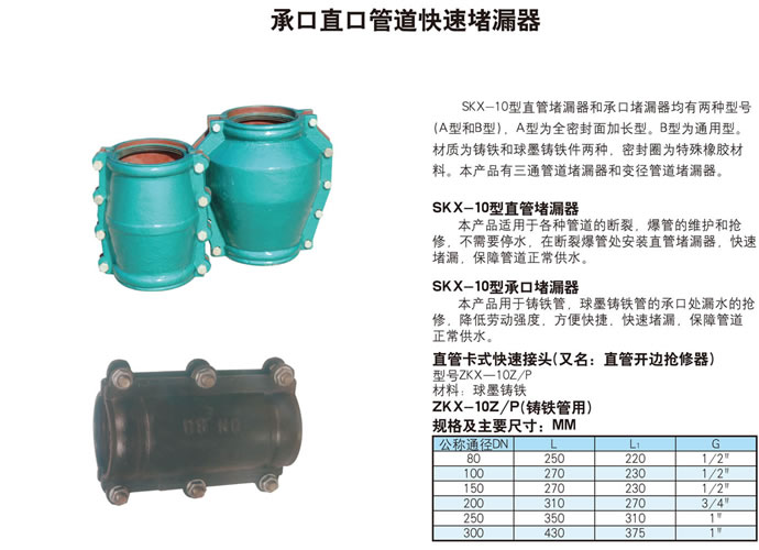 SKX-10型直管堵漏器和承口堵漏器均有兩種型號(A型和B型).A型為全密封面加長型。B型為通用型。材質為鑄鐵和球墨鑄鐵件兩種.密封圈為特殊橡膠材料。本產品有三通管道堵漏器和變徑管道堵漏器。